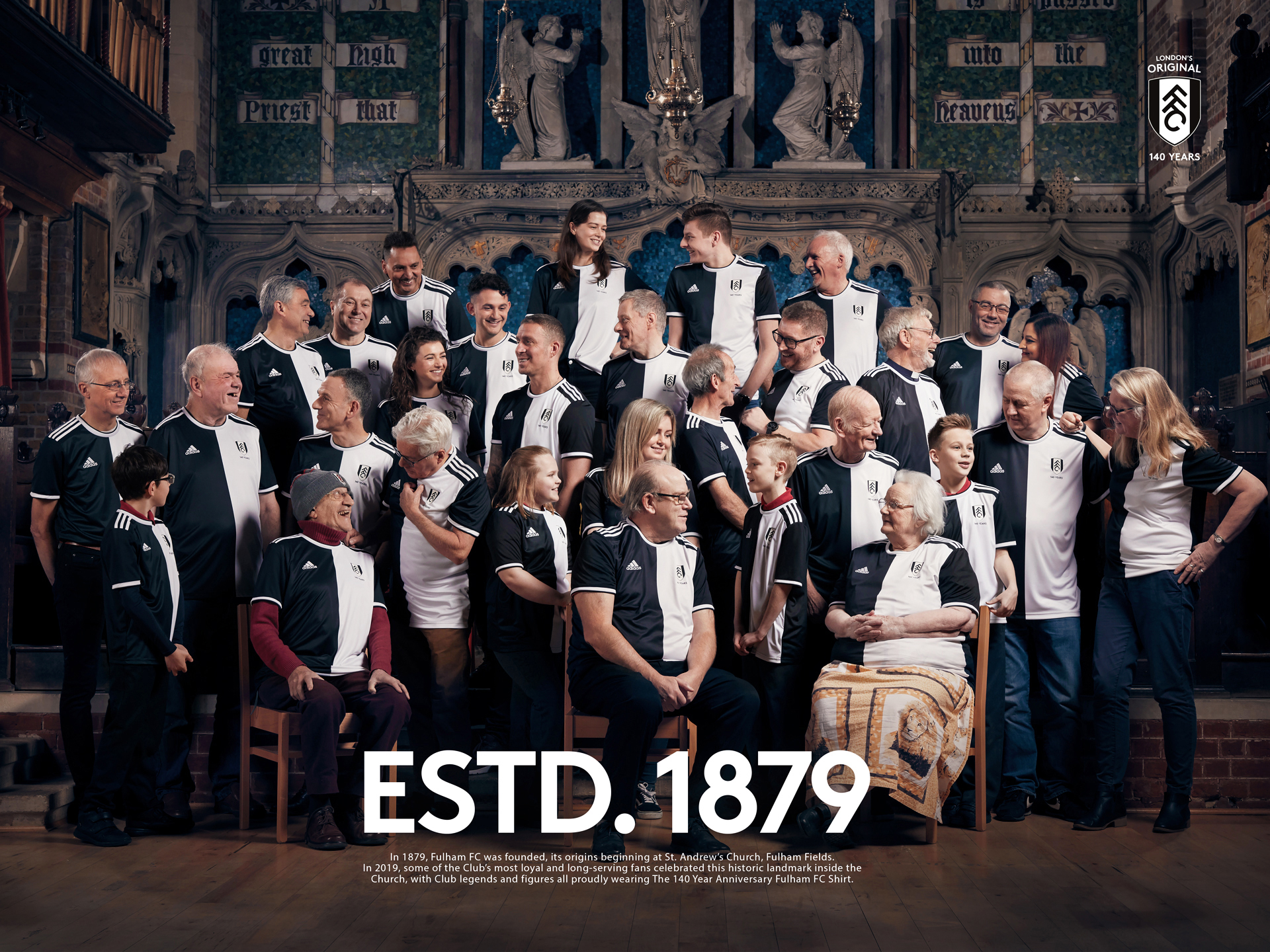 Church, with Club legends and figures all proudly wearing The 140 Year Anniversary Fulham FC Shirt.